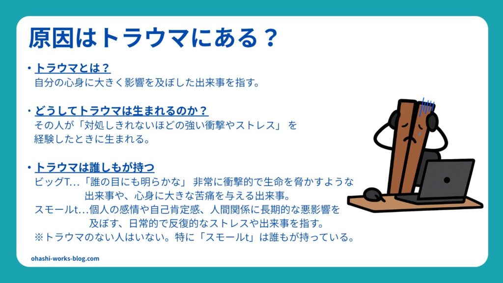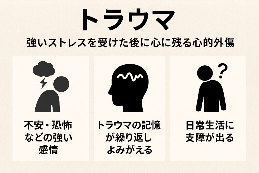 トラウマは、その人が「対処しきれないほどの強い衝撃やストレス」 を経験したときに生まれます。