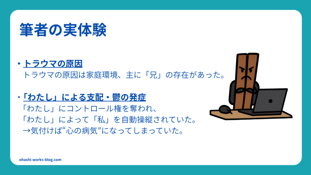 そのあともいろいろありましたが、恐らく私の「わたし」はこういったトラウマ体験から生まれたのだと思います。