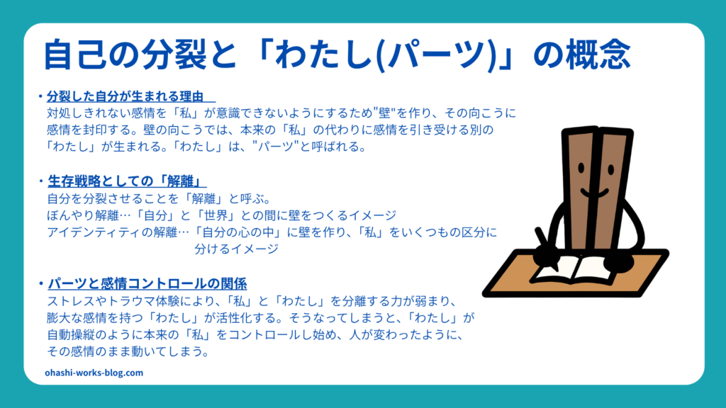 壁の向こうの「わたし」は、”トラウマ担当のパーツ“、あるいは単に”パート“や”パーツ“と呼ばれたりします。