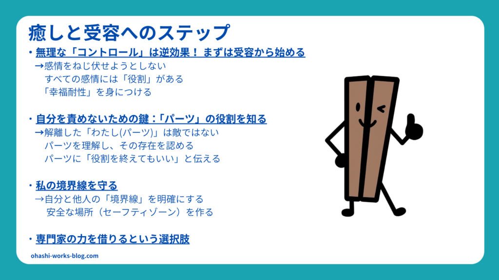 あなたの頑張りや感情の乱れは、性格や努力不足ではなく、トラウマから生まれた「生存戦略」(解離/パーツ)なのです。頑張ってくれた「パーツ」の存在と役割を認め、コントロールではなく「受容」することが頑張りすぎのループを断ち切ることにつながります。