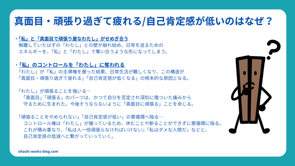- トラウマによってできた「頑張る」パーツが自分を動かしている