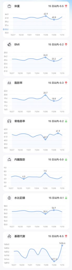 特に、毎日の体組成計の記録を見ると、平日に少しずつ減っても、週末の高カロリー摂取によってリバウンドするという波が顕著に現れていました。