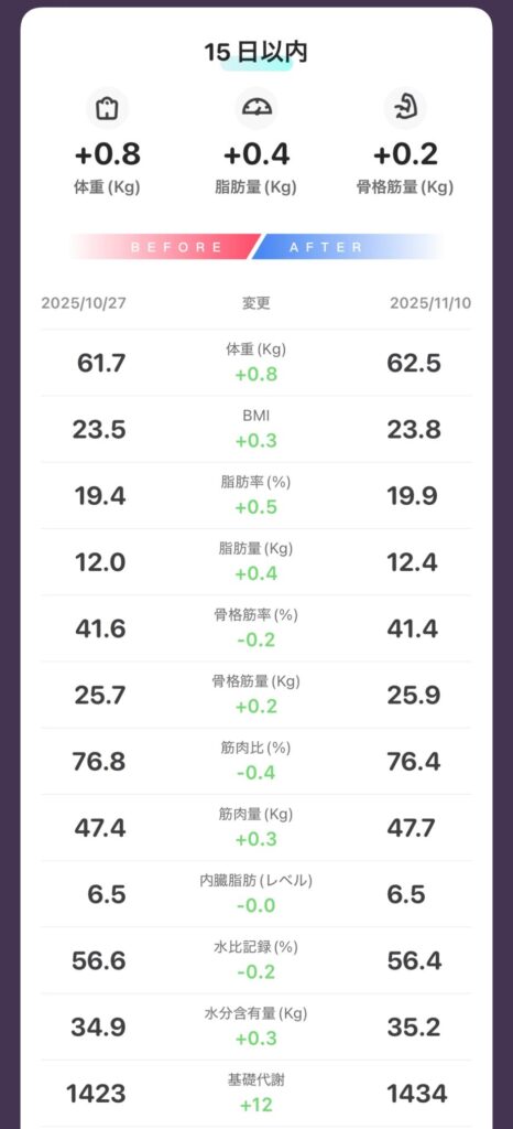 ・脂肪量:12.0kg → 12.4kg(+0.4kg)