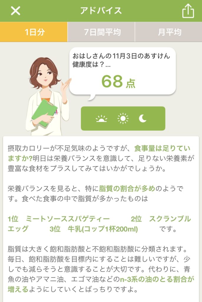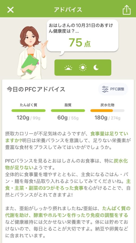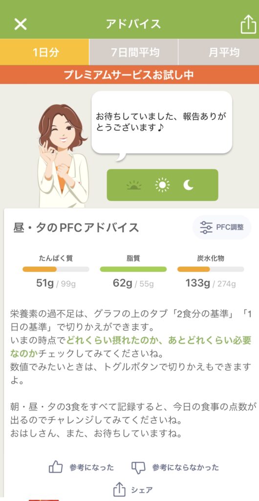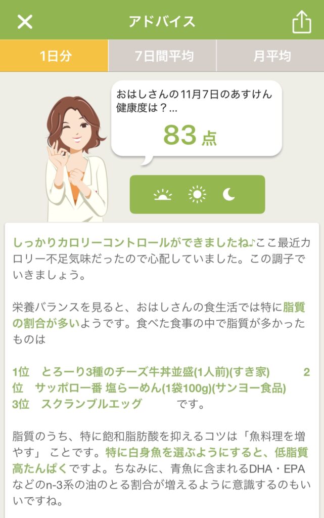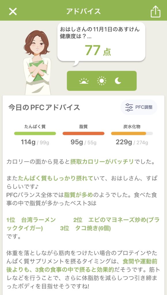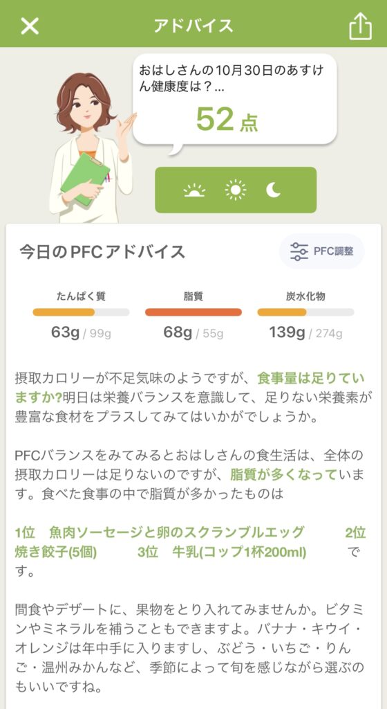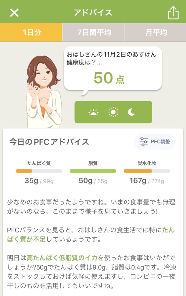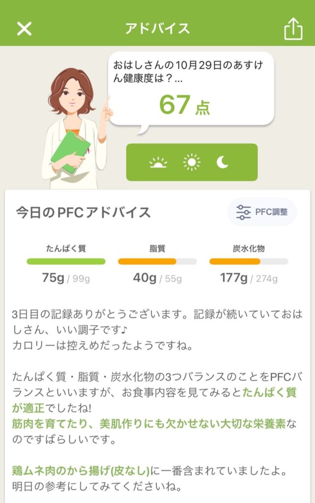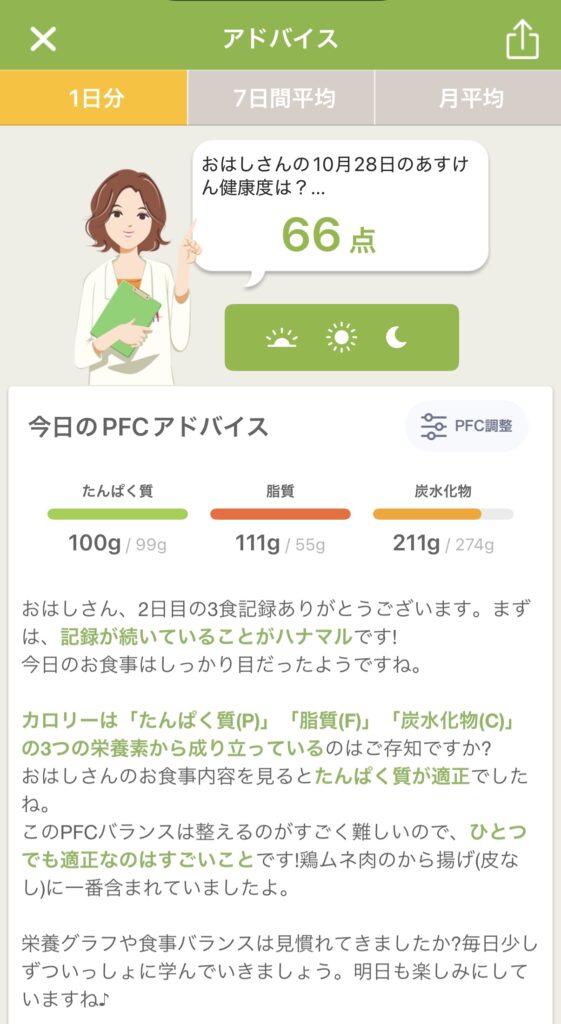 アドバイスとPFCバランス(タンパク質・脂質・炭水化物)のグラフから、私の食事についての傾向を考察してみました。