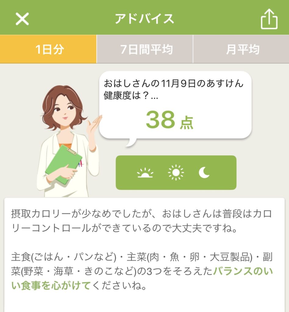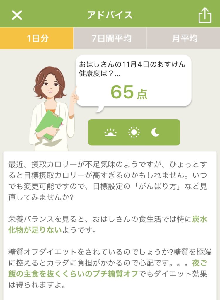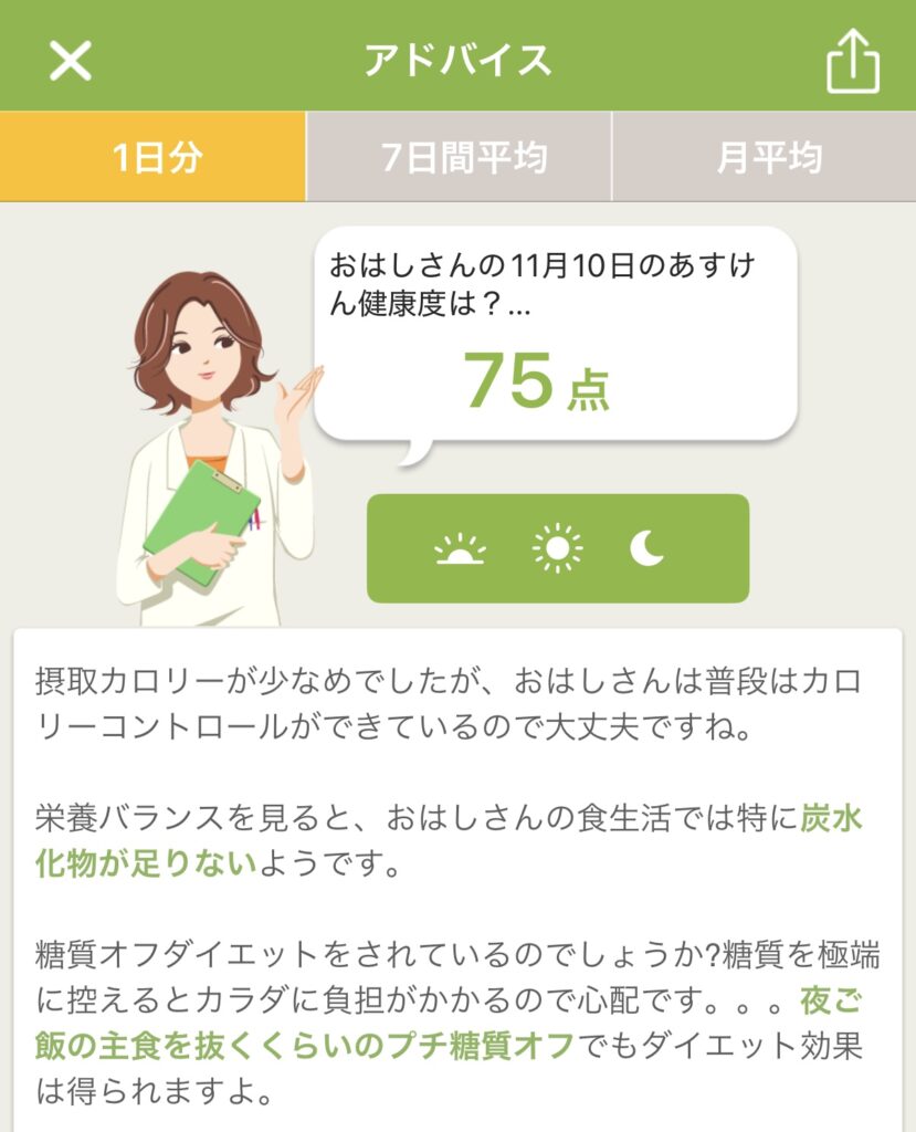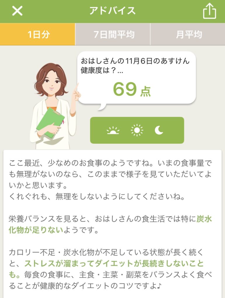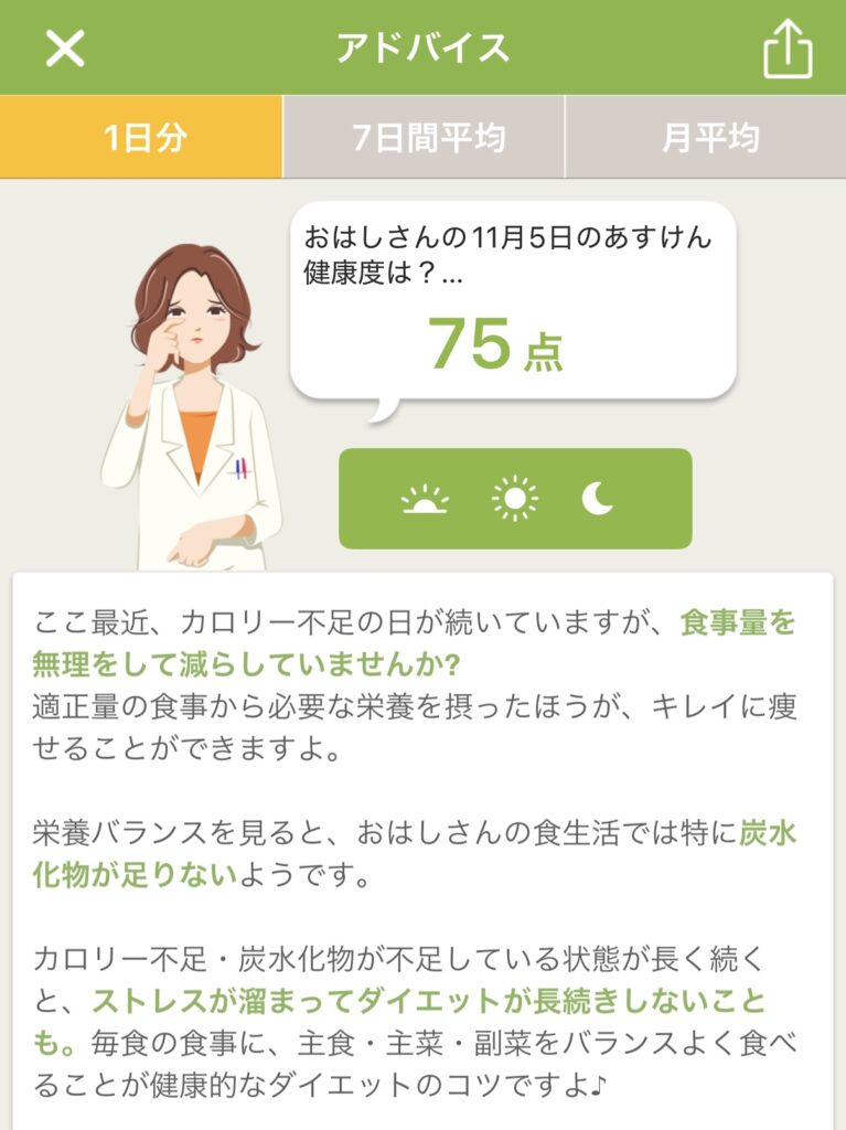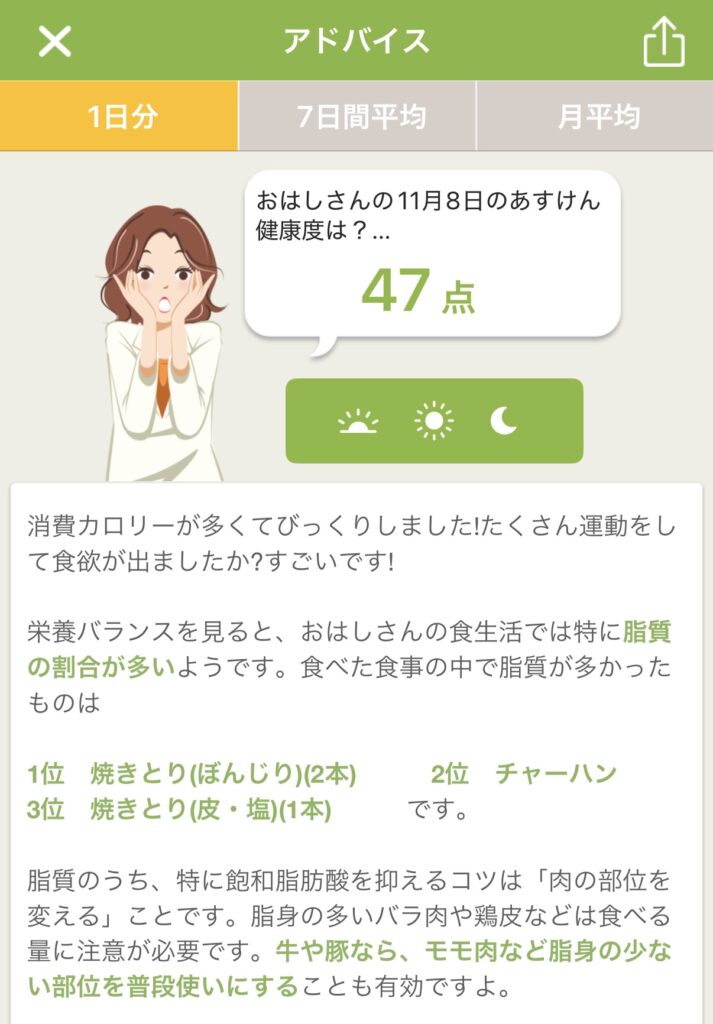アドバイスとPFCバランス(タンパク質・脂質・炭水化物)のグラフから、私の食事についての傾向を考察してみました。