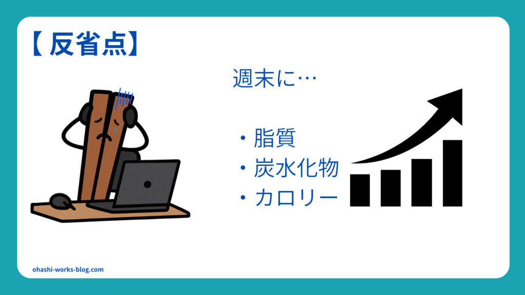 実際、私のXの記録を見ても、週末を境に体重がリバウンド気味になる日が多く、この週末の高カロリー摂取が、15日間の成果を打ち消してしまっていたのではないでしょうか🤔
