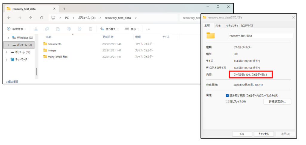 - 以下構造のテスト用データ:recovery_test_data (207ファイル・約5MB)がUSBメモリに保存されている ※全てダミーデータ