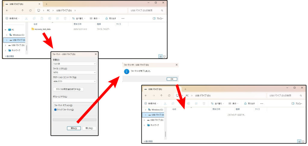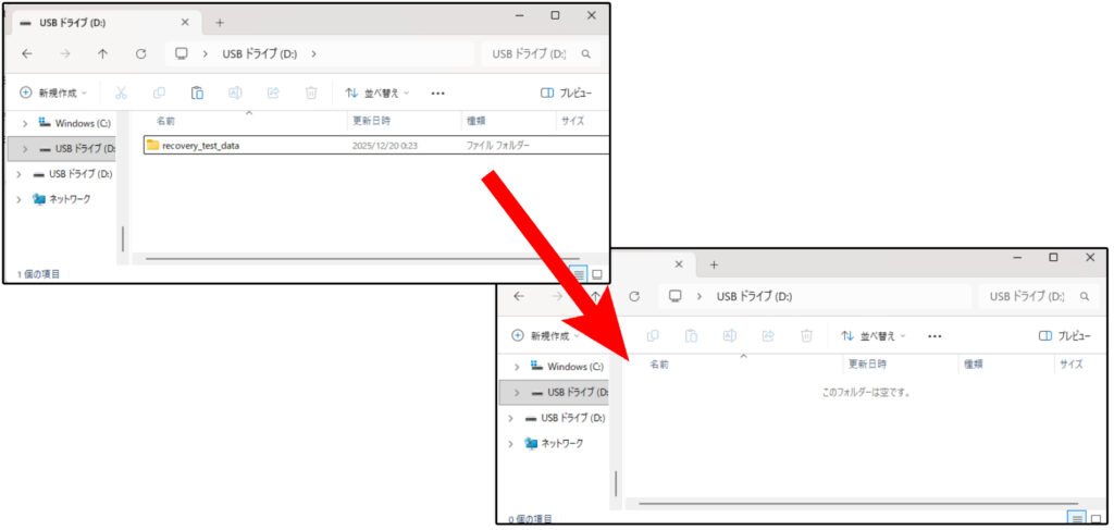 1.USBメモリに入れたデータを[shift + delete]で完全に消去した状態からの復元