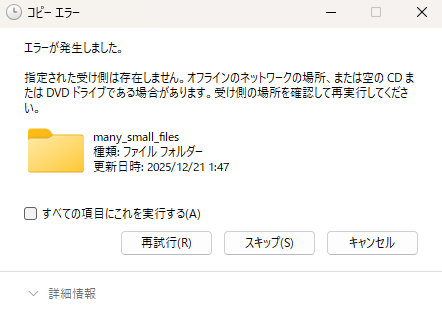 - USBメモリにデータをコピー中に接続が切れた状態からの復元
