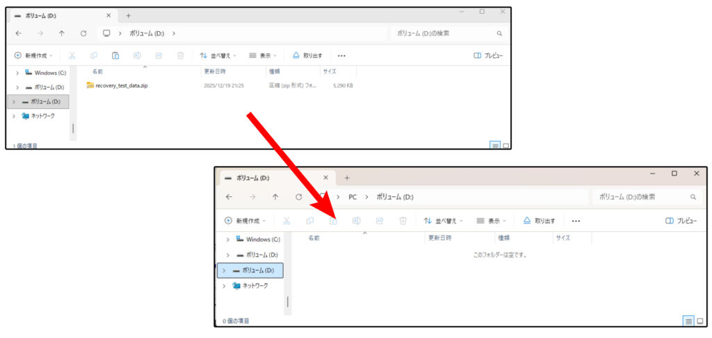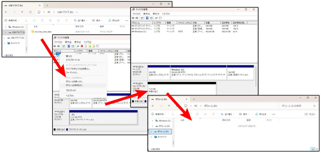 - USBメモリのパーティション(ボリューム)を削除し、「未割り当て」状態にしてからの復元