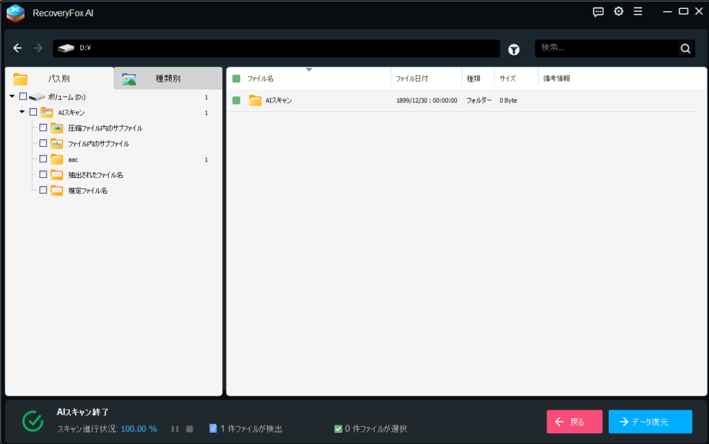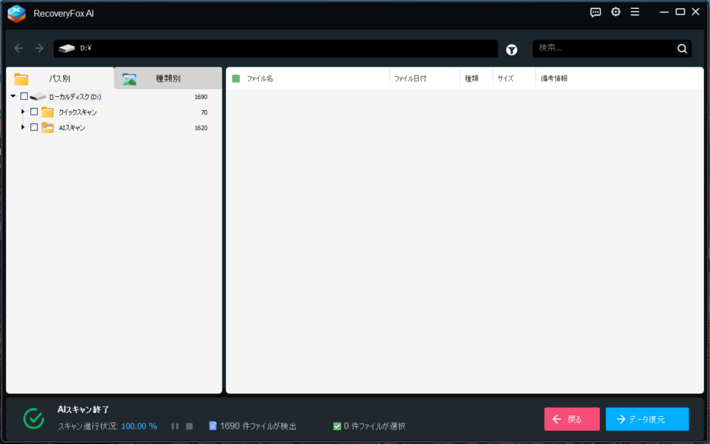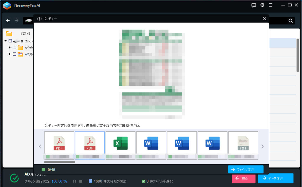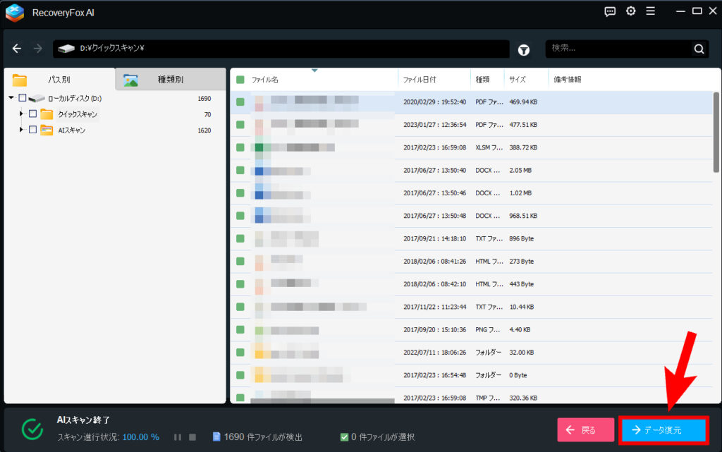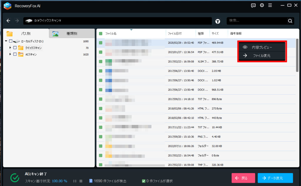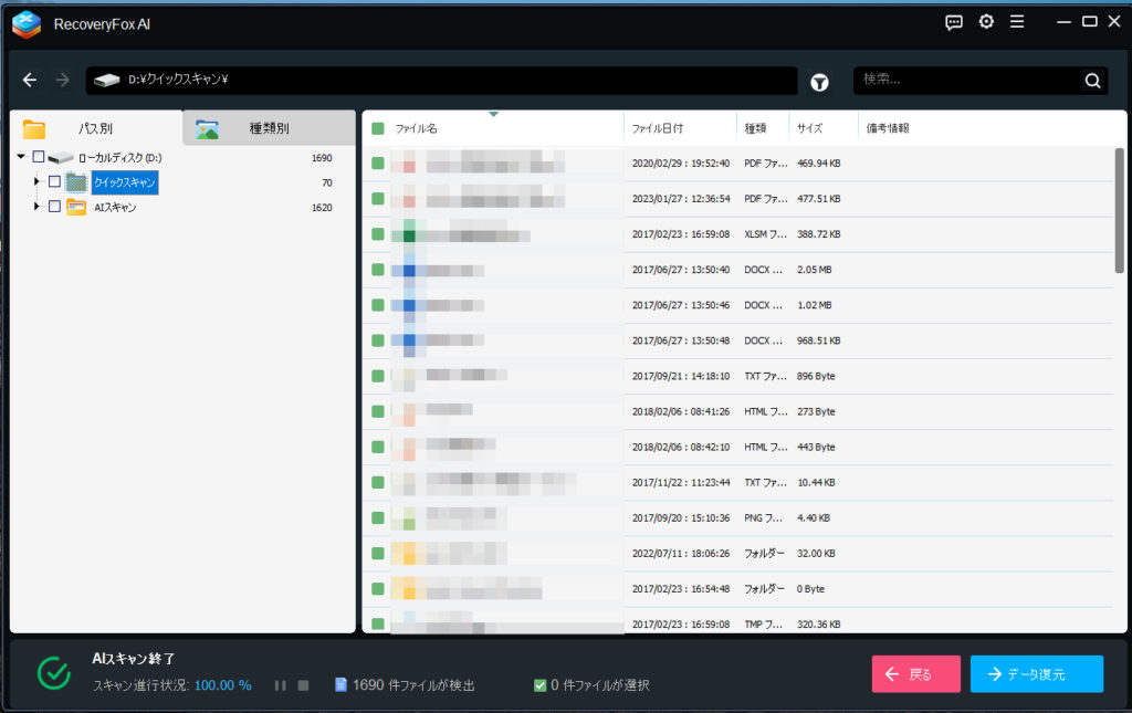 ↑スキャンが完了すると左側のウィンドウに「クイックスキャン」「AIスキャン」で検出できたデータが格納されたファイルが表示されます。