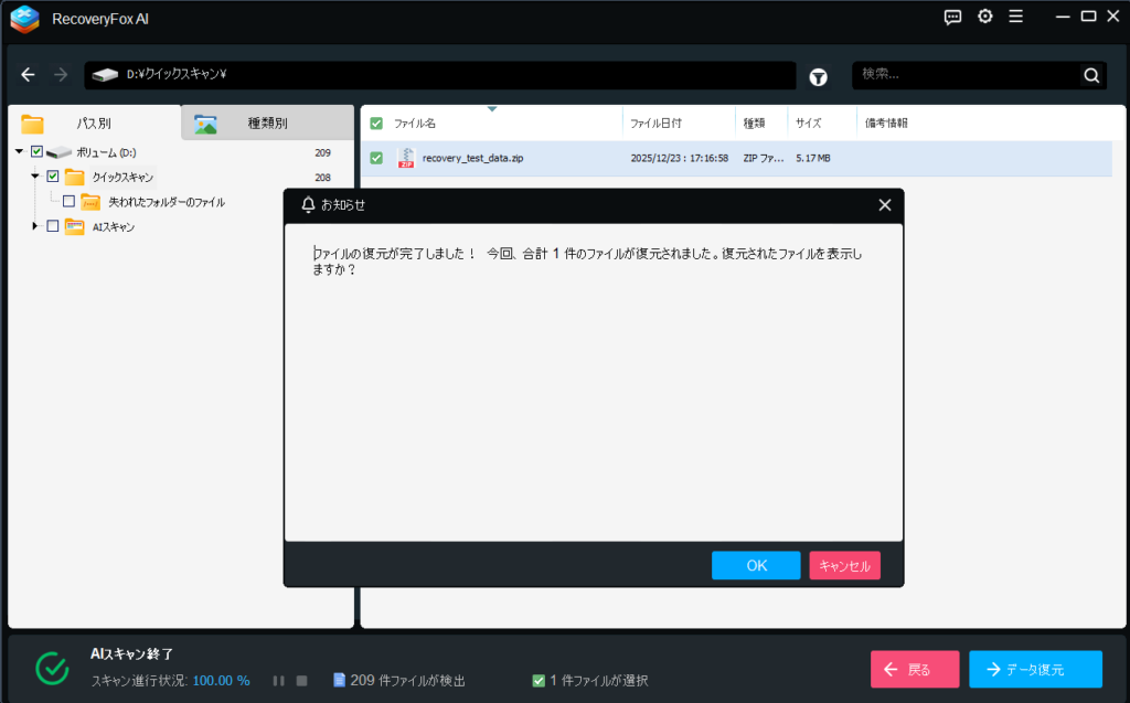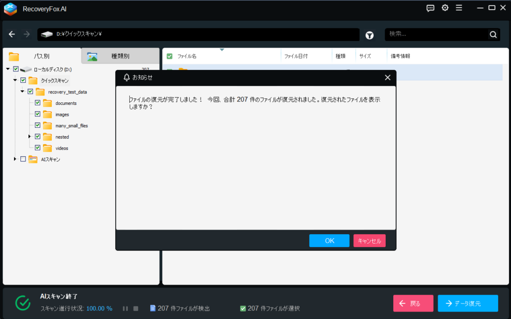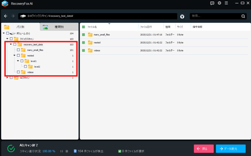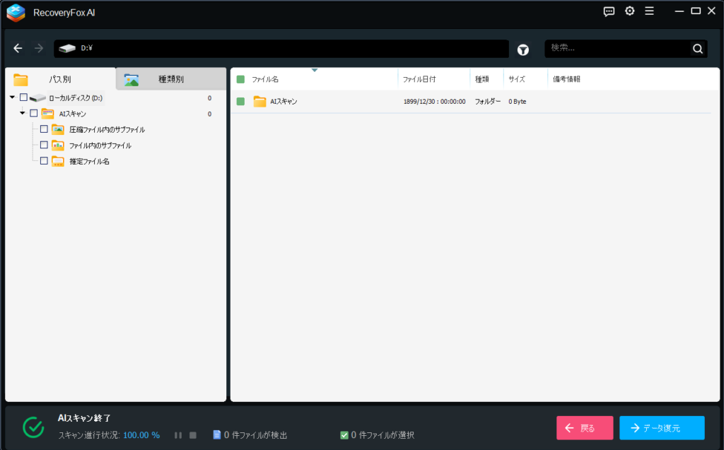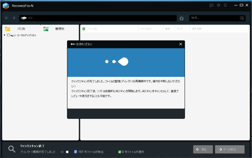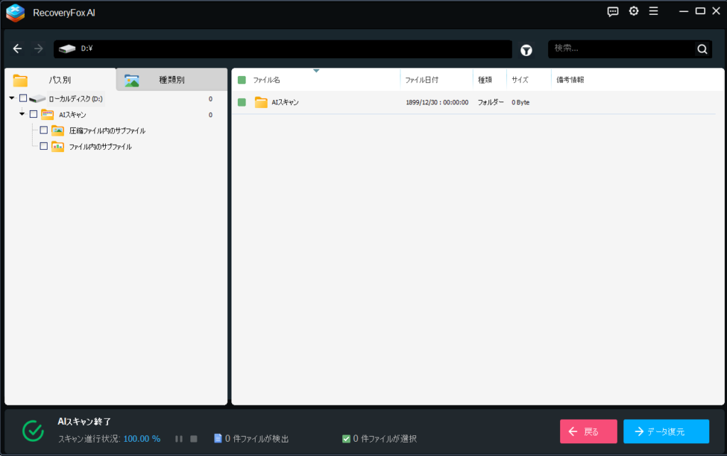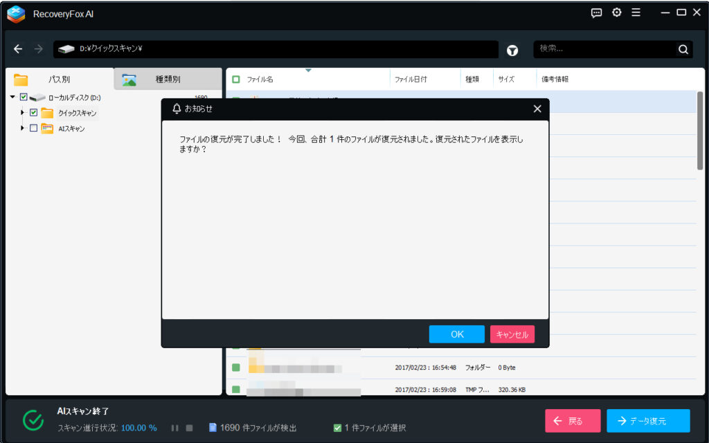 ↑スキャンが完了すると左側のウィンドウに「クイックスキャン」「AIスキャン」で検出できたデータが格納されたファイルが表示されます。