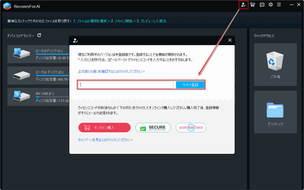 あとはそちらのラインセンスコードを入力画面で入力し、登録するとデータ復元の準備は完了👌
