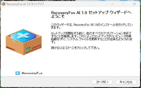 すると「recoveryfoxai.exe」という名前のソフトをセットアップするための実行ファイルをダウンロードできますので、こちらを実行し、PCにソフトをインストールします。